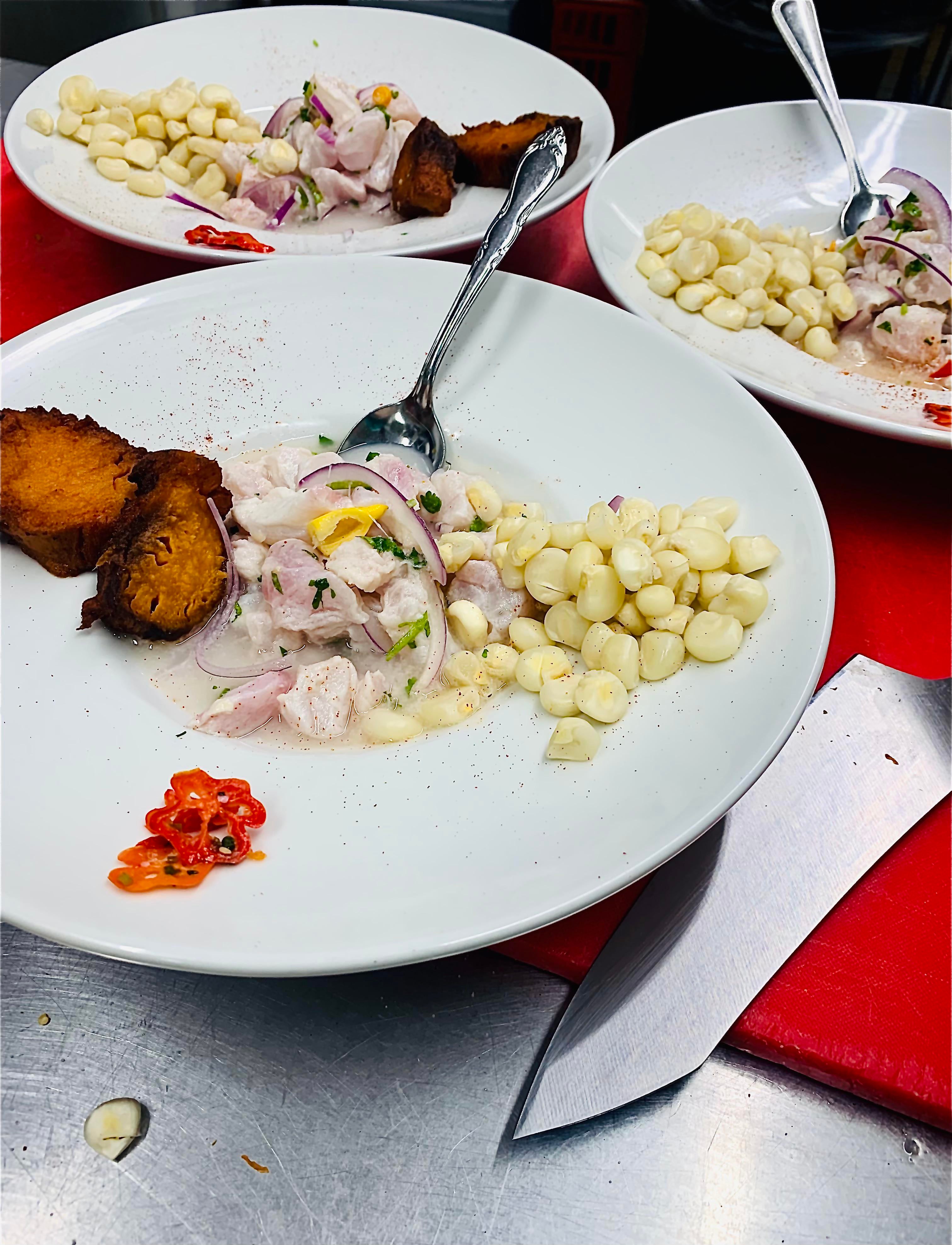 Ceviche- North Carolina- Lima Fusion. Morehead City Grouper, Fresh Lime, Sea Salt, Cilantro, Garlic, Red Onion, Homegrown: Aji Amarillo, Brazilian Starfish, Aji Lemon Drop, Aji Charapita, Local Sweet Potato, Peruvian Corn.
