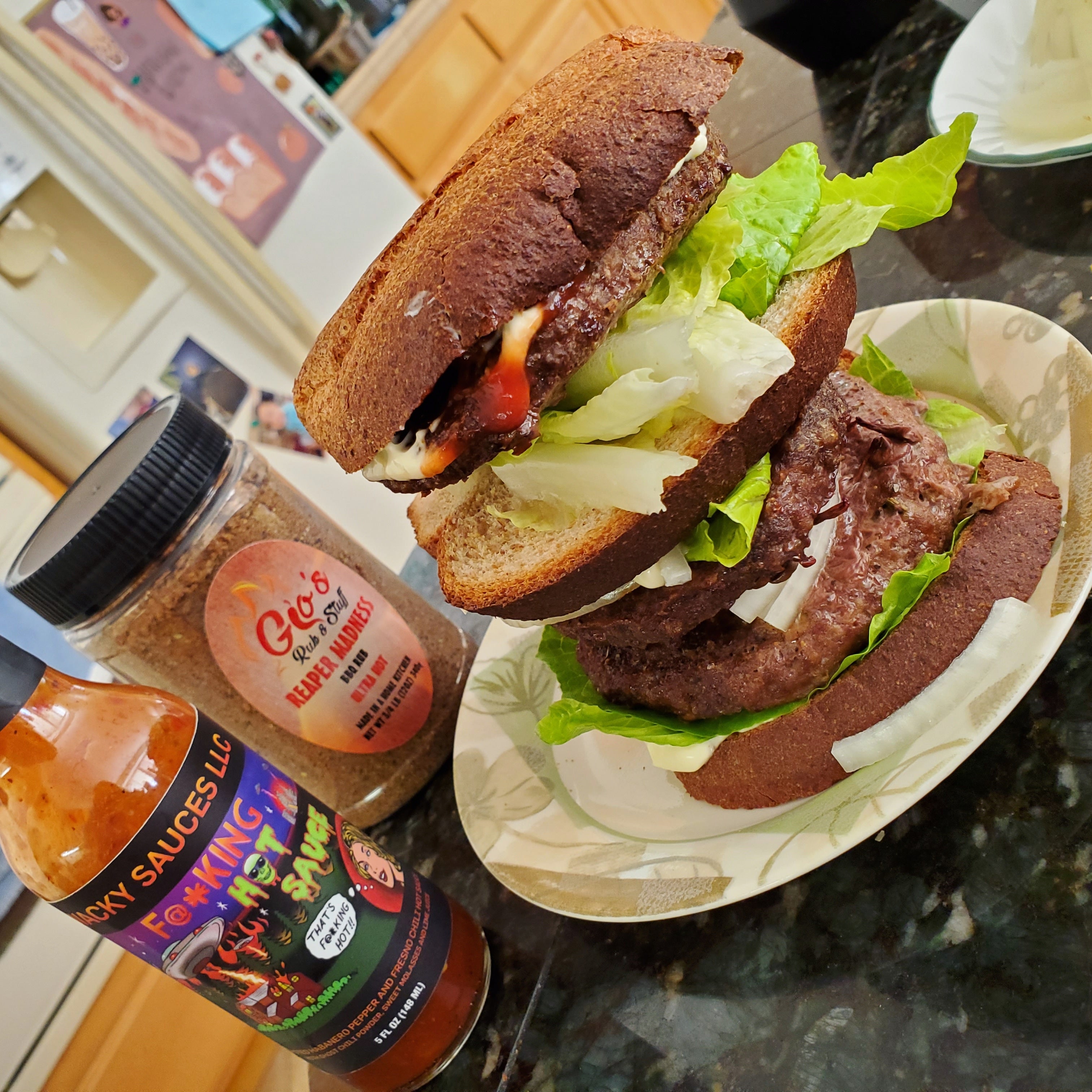 Used a dry rub with reaper pepper on the patties for this heavy burger Chilichili foodChili RecipesRecipeRedditReddit SpicySpicyspicy foodspicy recipes