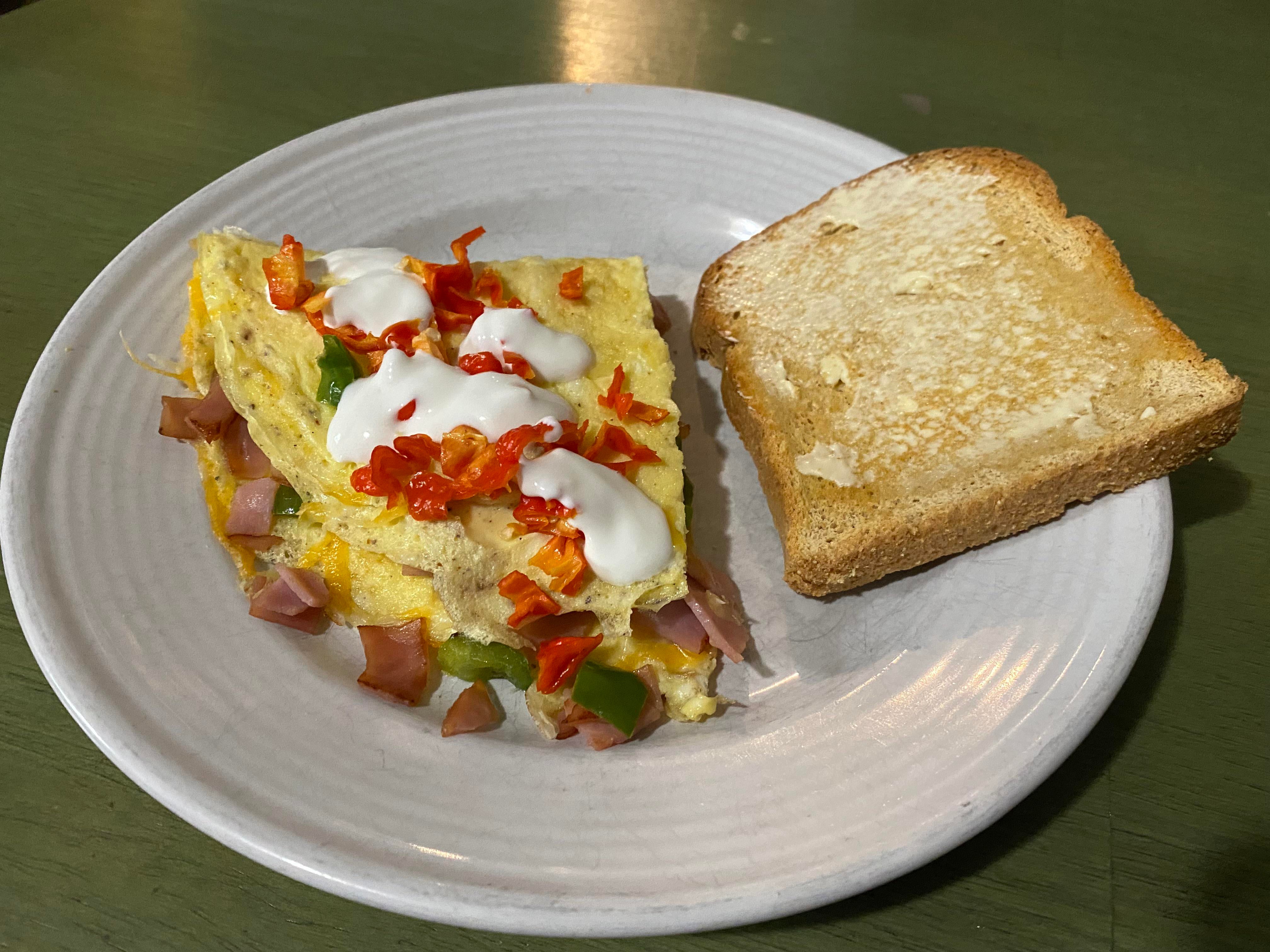 Omelette topped with Carolina Reaper and fresh crema Chilichili foodChili RecipesRecipeRedditReddit SpicySpicyspicy foodspicy recipes