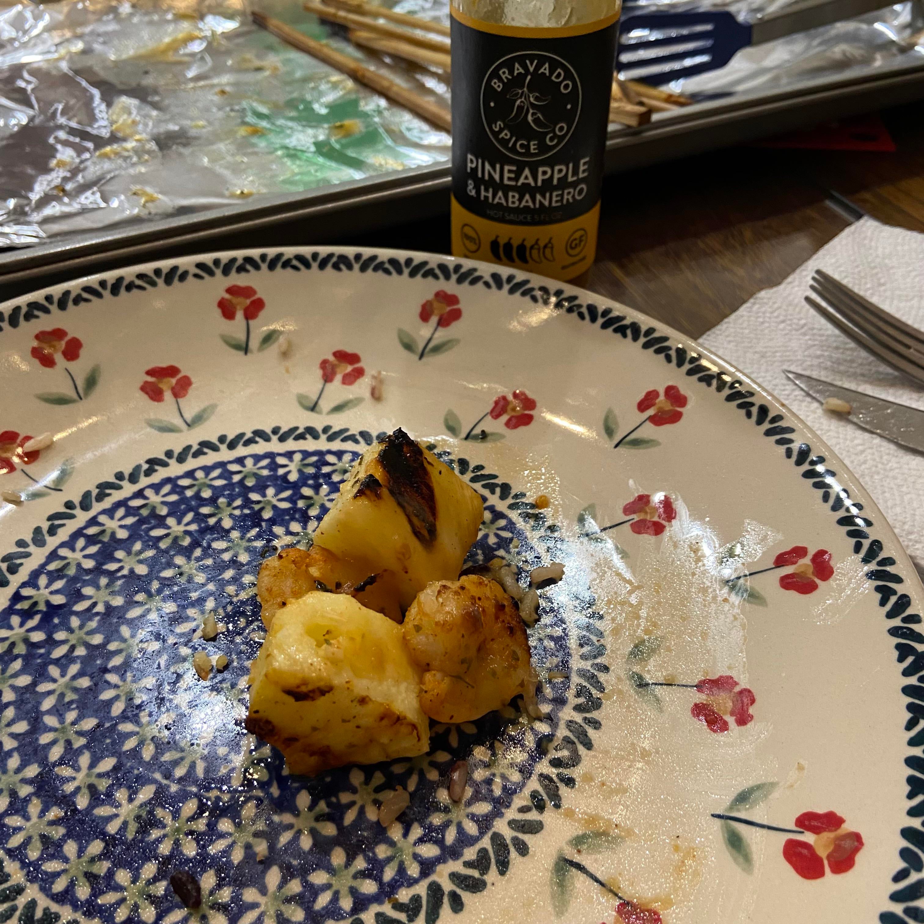 Grilled spicy garlic and lime pineapple shrimp with Bravado hot sauce (highly recommend)