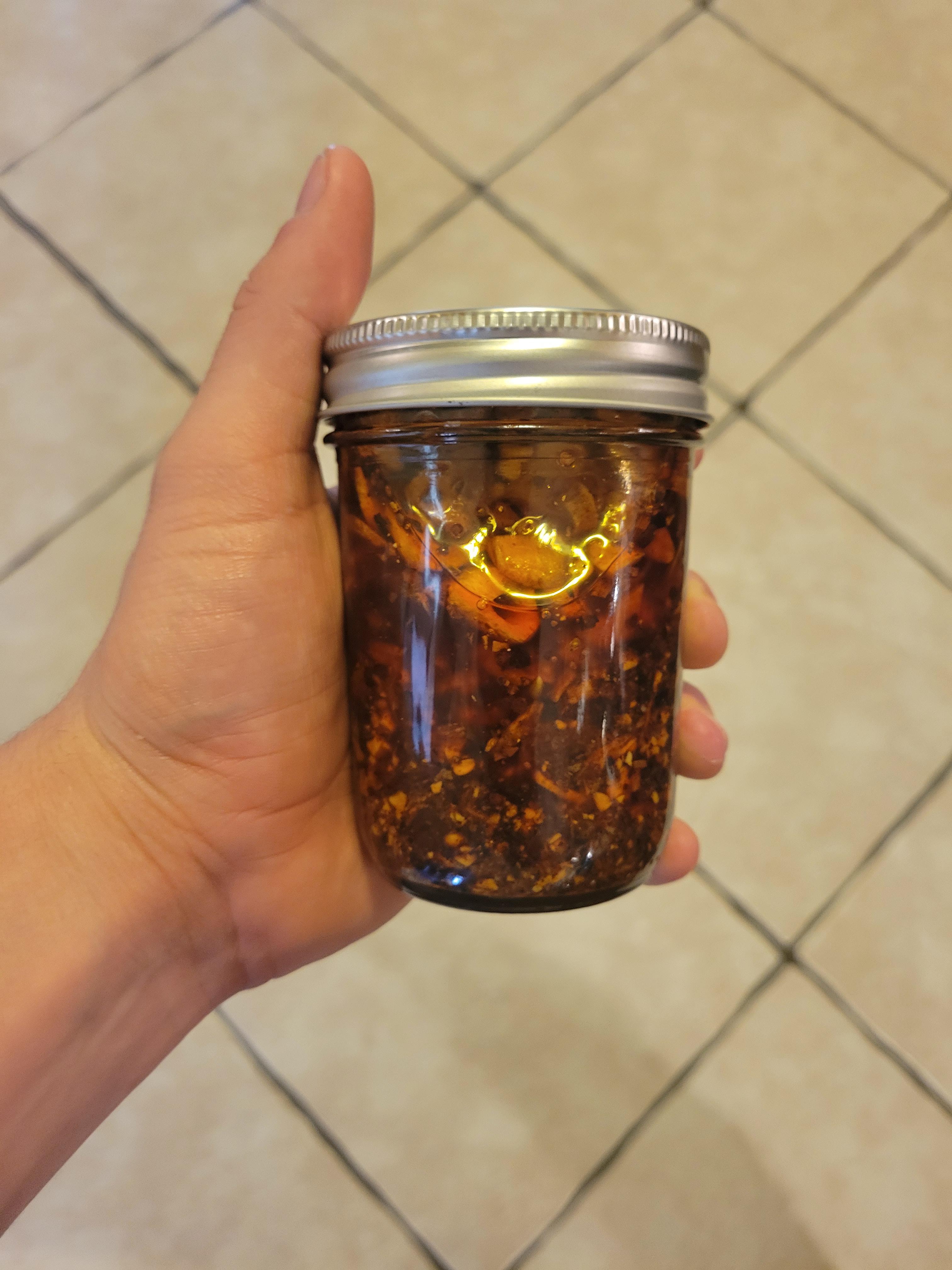 My sister gave me some homemade chili oil for Christmas. It’s got dried reaper and other chilis, fried onions and shallots and garlic, and anise seed. Tastes super good and can’t wait to put it on pizza