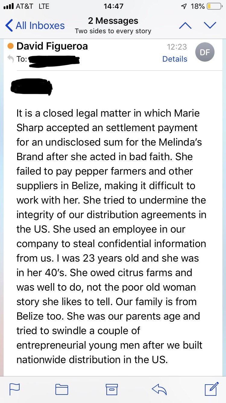 I’m a longtime fan of Melinda’s, and I’ve recently become interested in the history of this company. There are two narratives at play: the primary being from an [interview with Marie Sharp](http://www.belizemagazine.com/edition04/english/e04_05questions.htm) where she claimed she was swindled out of her own business in a hostile takeover. To my knowledge, there has been no “other side of the story” that has been comprehensively covered. However, the owner of the Melinda’s Hot Sauce company had [an alleged email exchange](https://imgur.com/a/zIh39PK/) released where he claimed that this narrative was inaccurate.