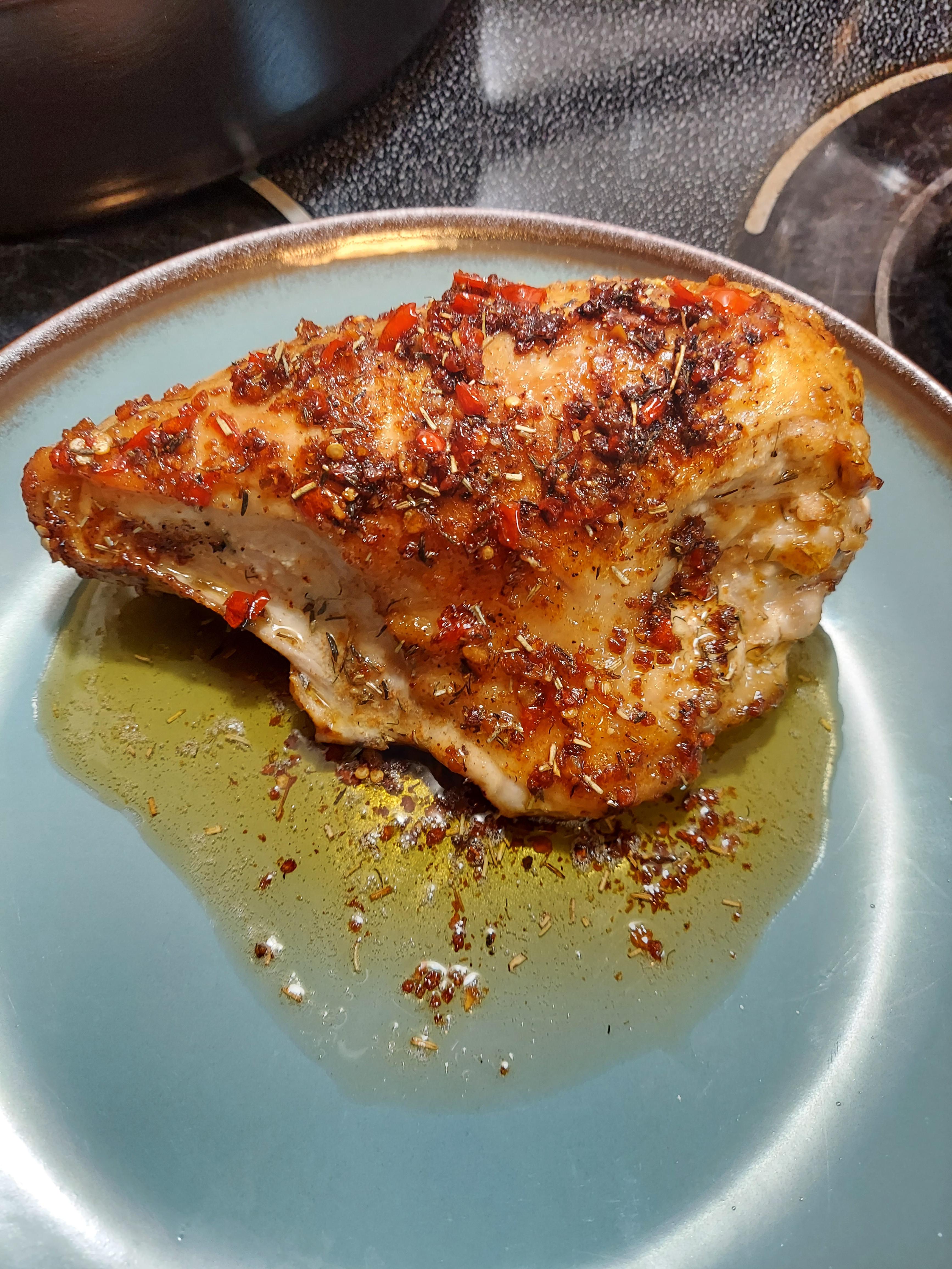 Roasted and deglazed chicken breast with garlic, butter, finely chopped fresh picked ghost peppers I grew. Chilichili foodChili RecipesRecipeRedditReddit SpicySpicyspicy foodspicy recipes