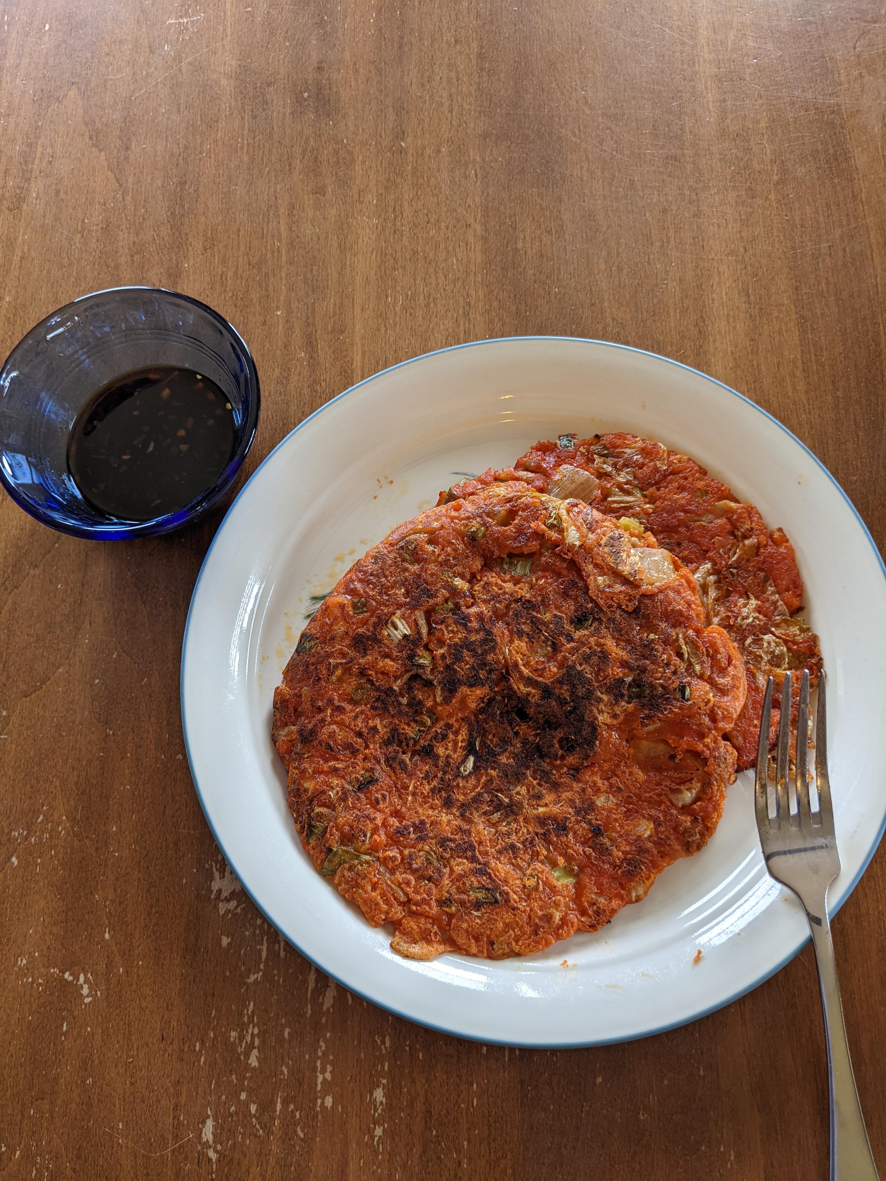 Homemade kimchijeon. Had to use store bought kimchi, so I spiced it up with half a smoked super hot.