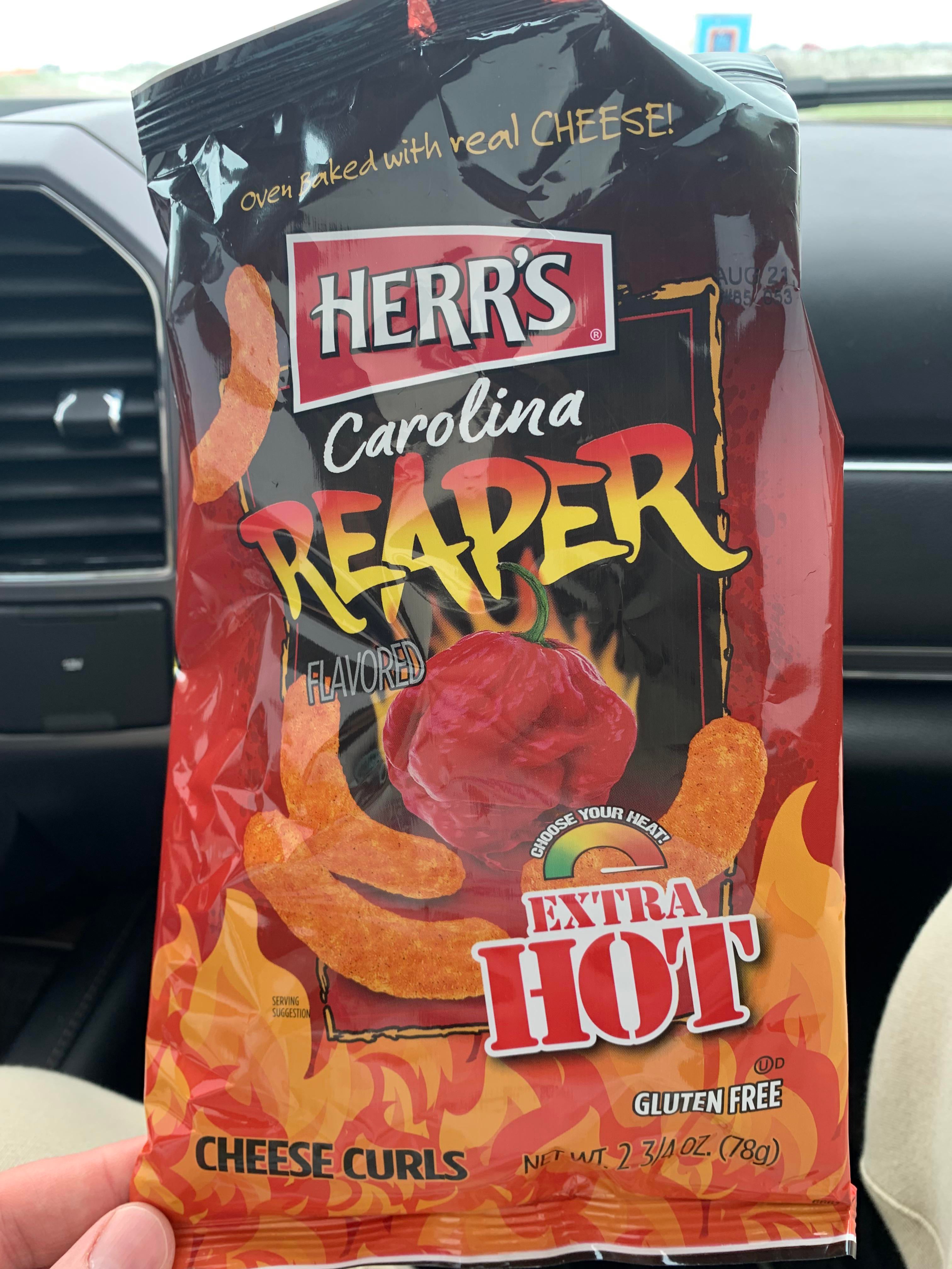 Herr’s Reaper cheese curls. They are actually a cheese puff and exactly what you might think of a cheaper gas station find claiming to be a reaper product. Not much heat (3/10), decent flavor (5/10).