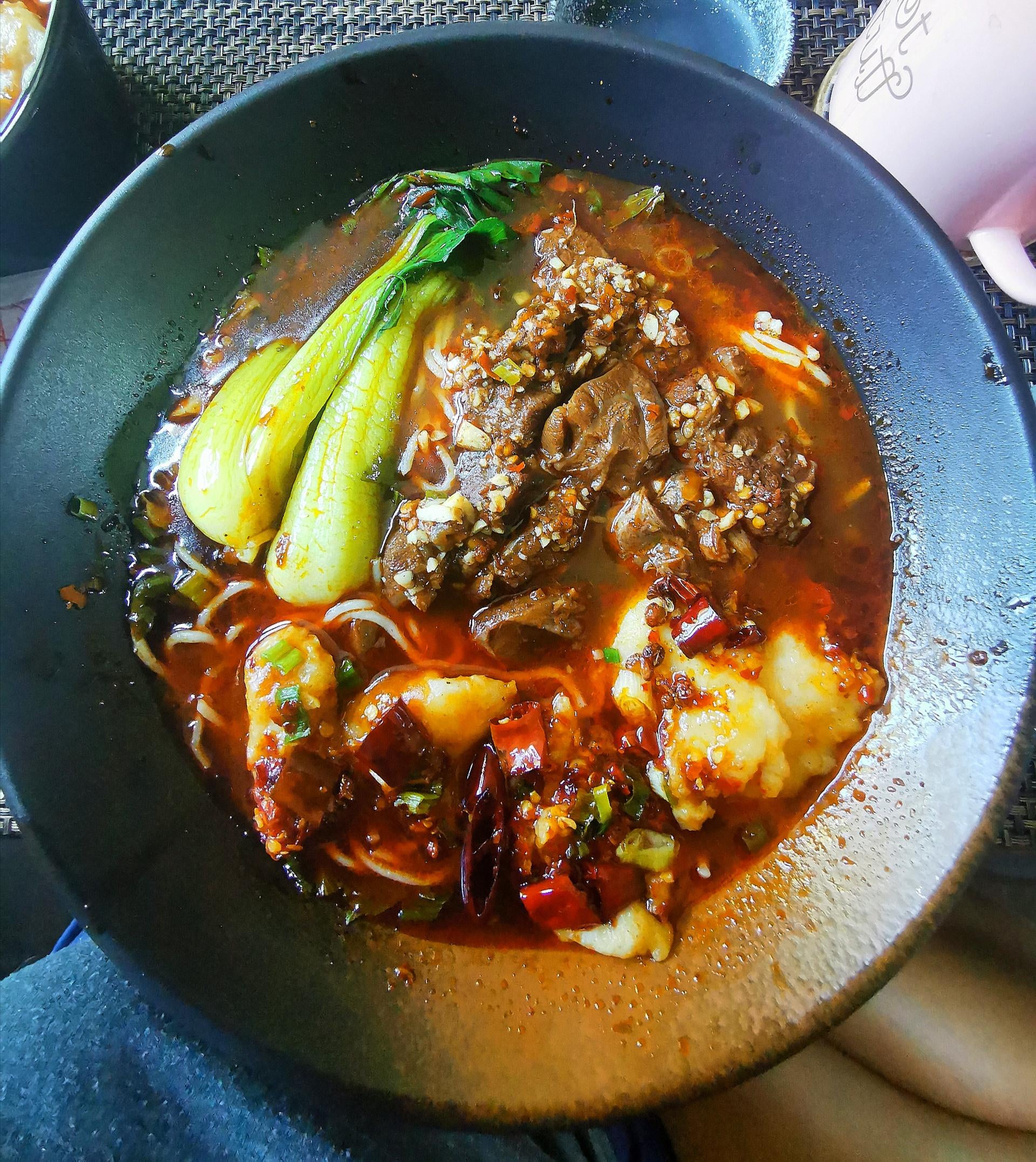 Sichuan braised beef and boiled fish noodle soup. Woke up with feeling stuffy and needed this, now I can’t feel my mouth.