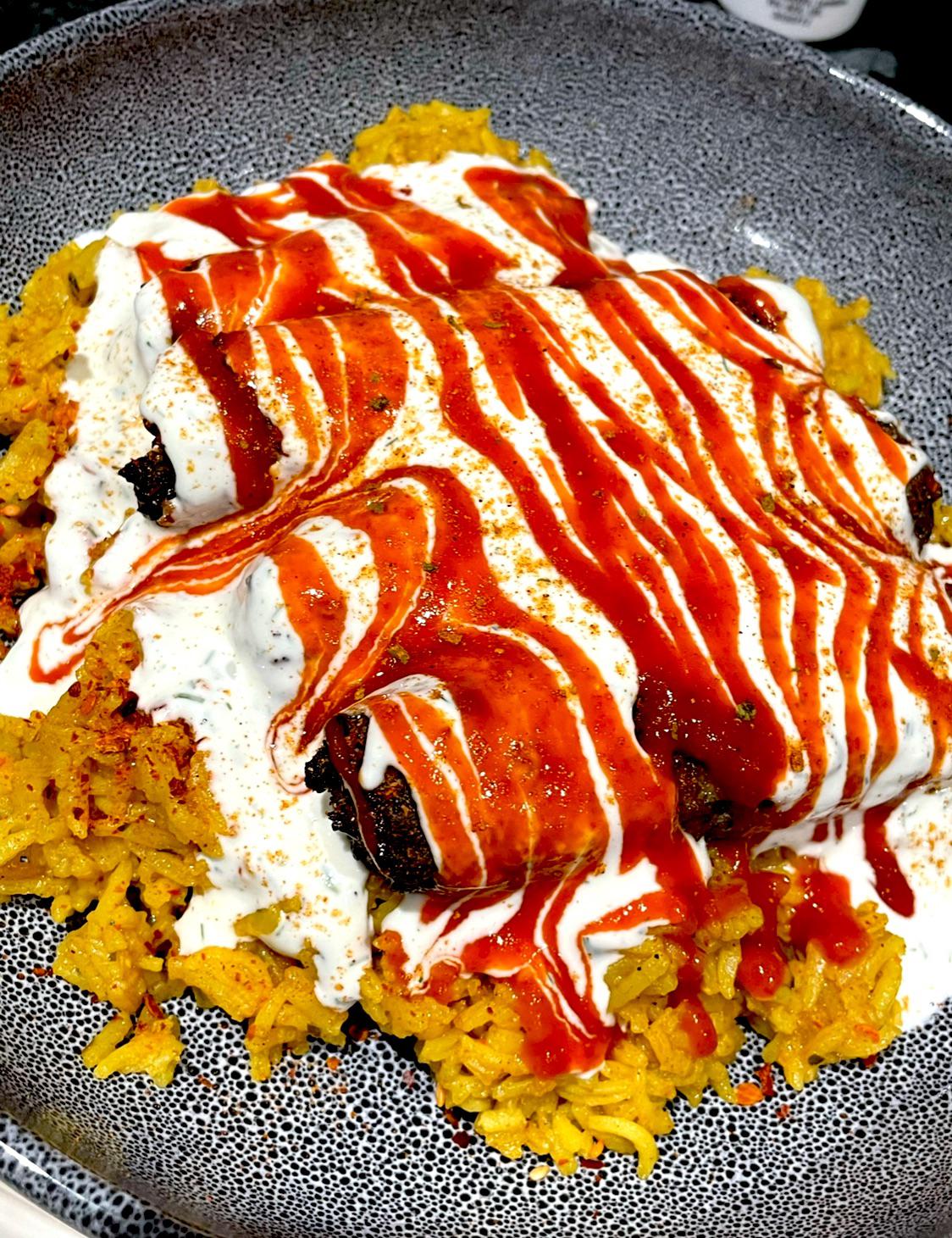 Lamb kofta kebabs over chicken flavoured rice with my own halal guys white sauce and Tabasco sriracha