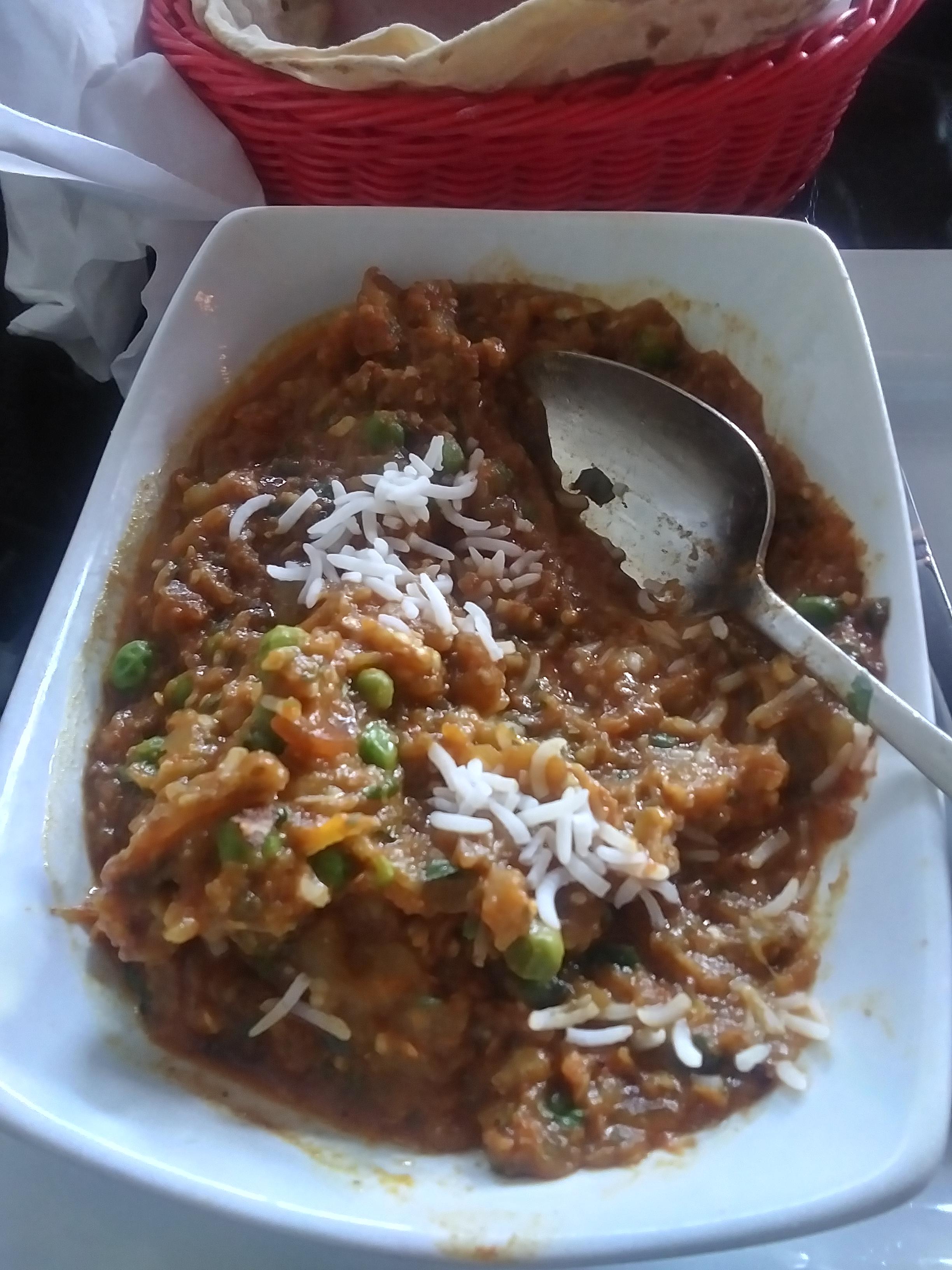 Eggplant bharta, offered spicy levels 1-5 and Indian level. Figured since I was at raw habanero level spice tolerance it would be no big deal. Boy was I wrong. Wiping my eyes and nose with my napkin.