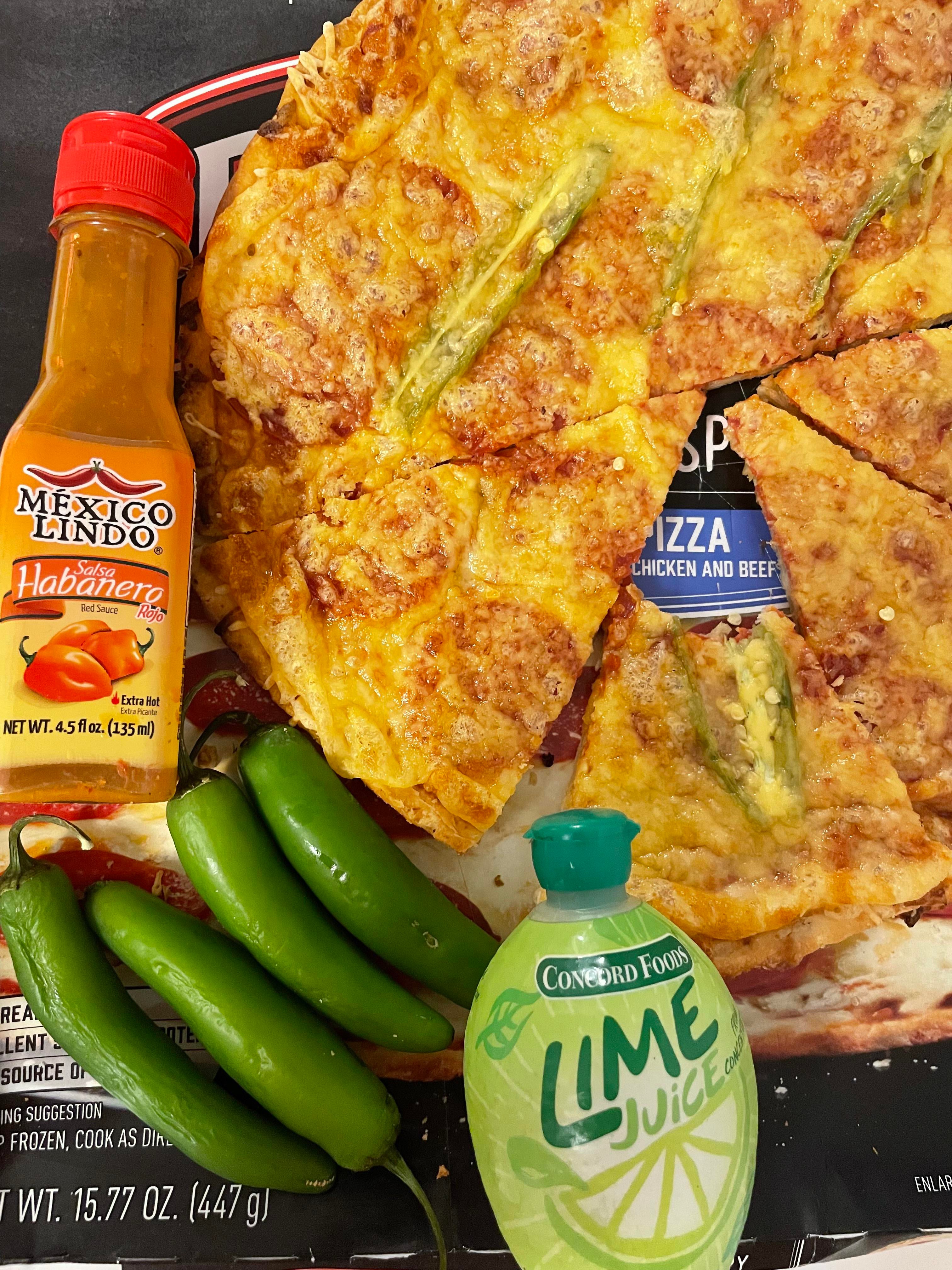 I took a thin crust pepperoni Red Baron pizza and threw on some of these peppers I found at the store and some gouda cheese and now I’m splashing it with one of my favorite hot sauces and lime juice while I dip it in ranch. I’ve outdone myself tonight.