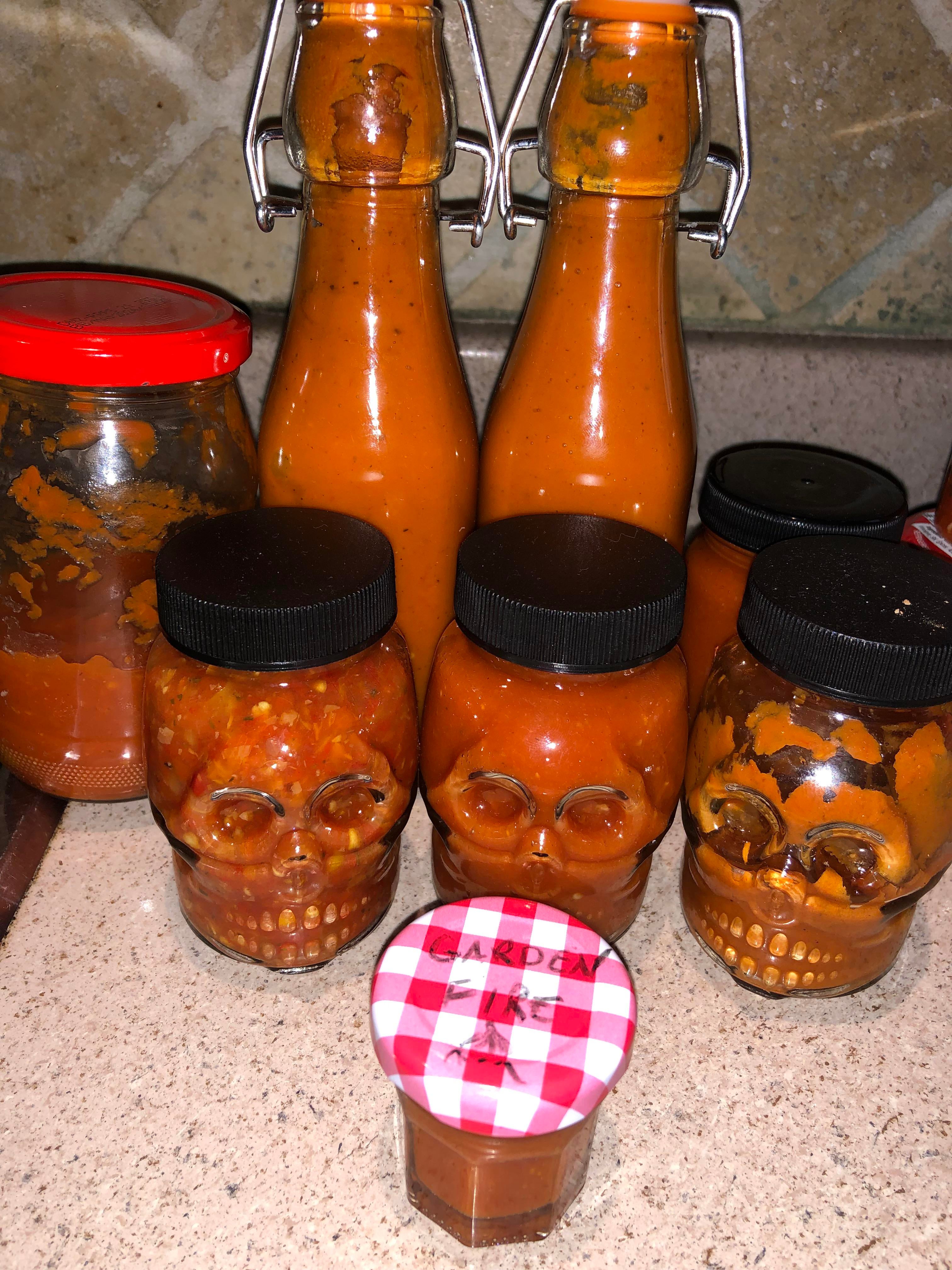 Our homegrown “Garden Fire” sauce – Trinidad scorpion, ghost, naga viper and Carolina reaper peppers + two tomatoes.