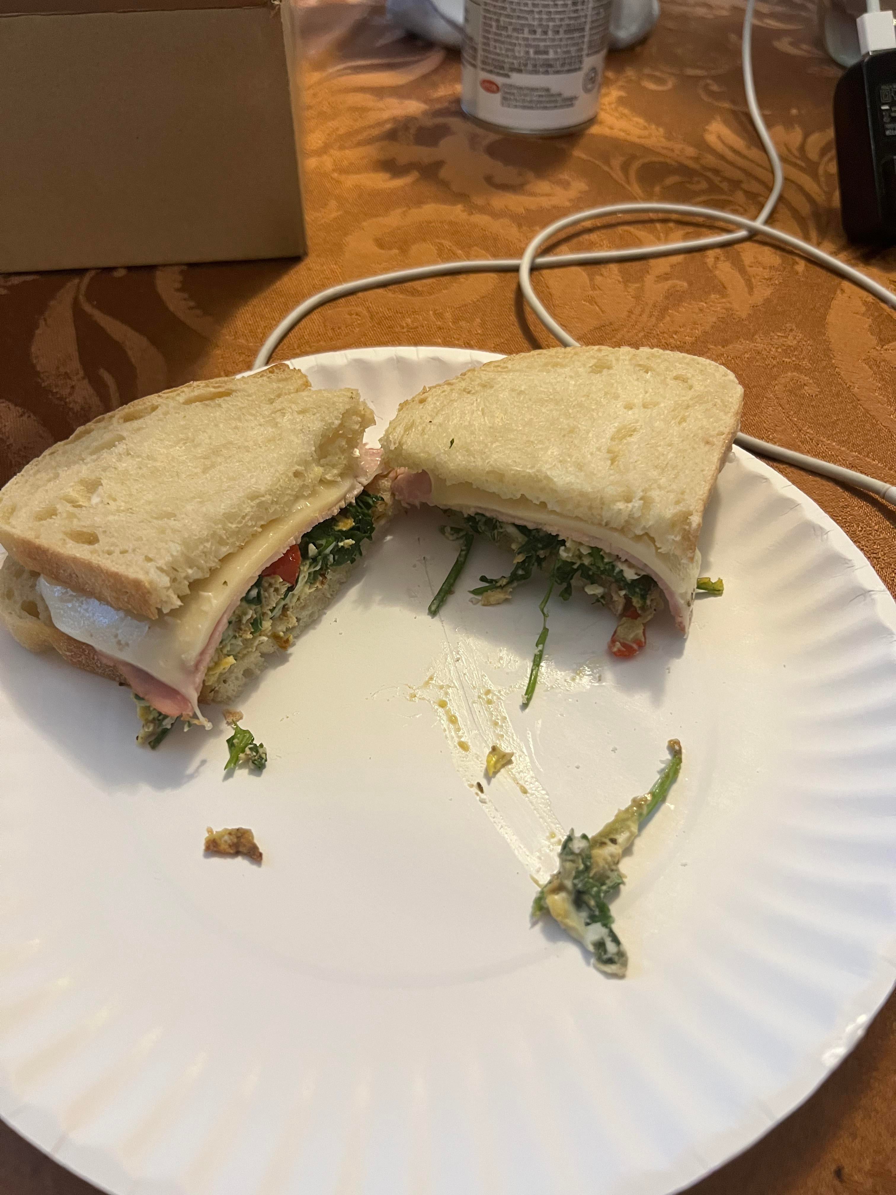 My sandwich. Ghost pepper, egg, coriander, Swiss cheese, deli ham, Cheyenne, celery seed, minced garlic, basil. Cooked in extra virgin olive oil, on French bread smeared with mayonnaise. It was delicious.