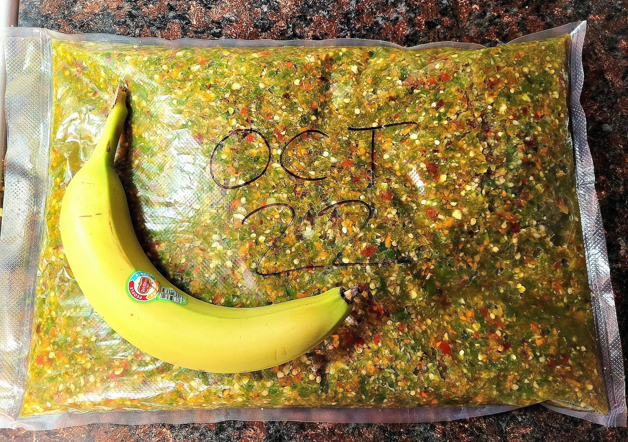 5 lbs of pepper mash (a blend of jalapeno, birdseye, chocolate habanero, apocalypse scorpion, and red reapers. Mixed with Walla Walla sweet onions, Russian garlic and carrots) All vacuum sealed to spend the next month in the cupboard lacto-fermenting. Banana for scale.